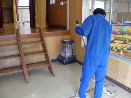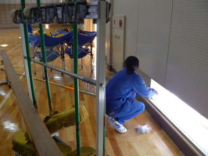 体育倉庫の中や窓のさんなどを丁寧に掃除しています。