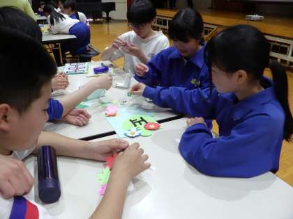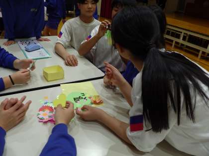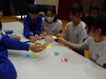 お宝組み立ての様子です。 校訓が書かれたボードをきれいに飾りつけしています。
