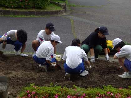 花の苗を地域の方が届けてくださり、花壇に植えています。