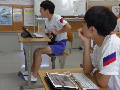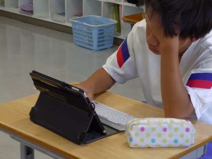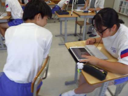 タブレットを使って、周りの生徒と相談したり、一人でじっくり考えたりしています。