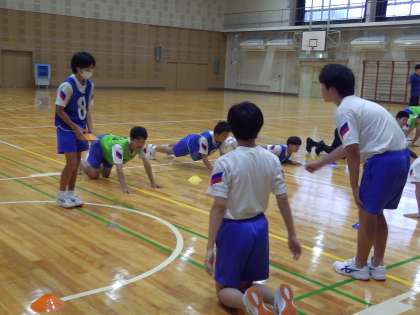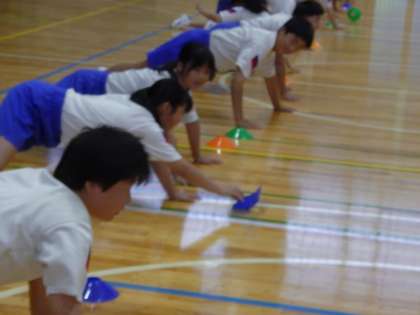 二班に分かれて、プランクの姿勢からマーカーを投げ合うことをしています。