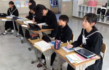 話合いで互いの様子が分かるように“コの字型”に机を移動して、学習しています。