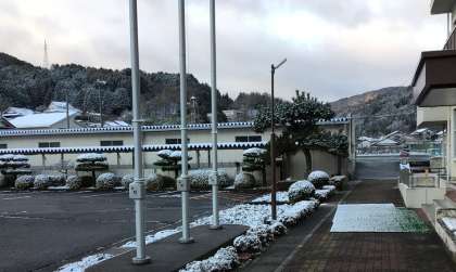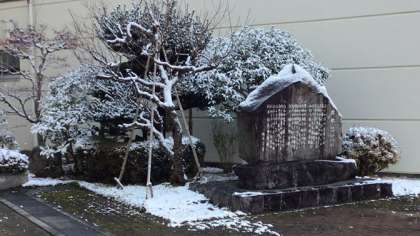 前庭の木々や校歌碑にうっすらと雪が積もっています。
