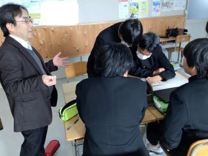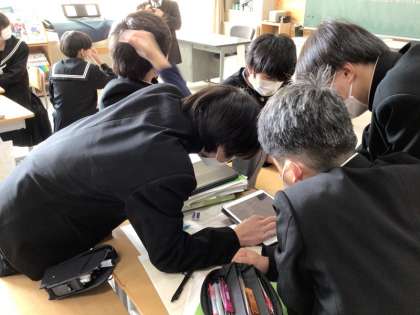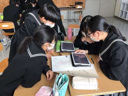 2年生の社会では、豊田市博物館との博学連携の一環として、伊能忠敬の足跡を学んでいます。全国を測量した伊能忠敬、稲武にもその資料は残っています。生徒たちは興味津々で、資料やタブレットと向き合っています。