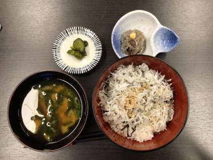 篠島に到着し、お待ちかねの昼食「しらす丼」です。今日は特別に、「生しらす」も出してもらいました。