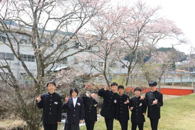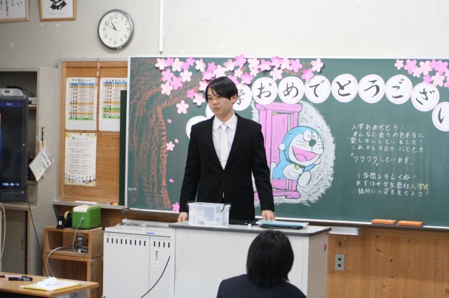 1年生の学級活動の様子です。担任から、この1年間でめざしてほしい姿を伝えられ、真剣に聞いていました。教科書の配付と、レクを行い、桜の下で学級写真を撮影しました。