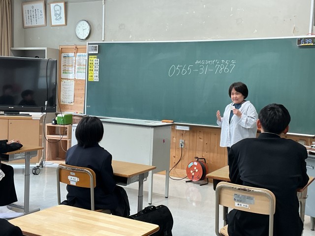 スクールカウンセラーが1年生教室に訪問。相談窓口の紹介をしました。