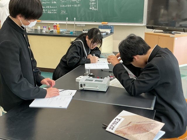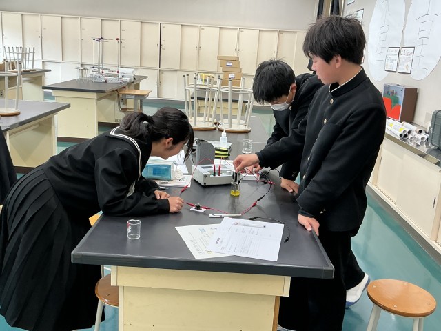 理科の授業では水溶液に電流を流す実験を行っています。グループごとに協力し合って実験と観察を行っています。