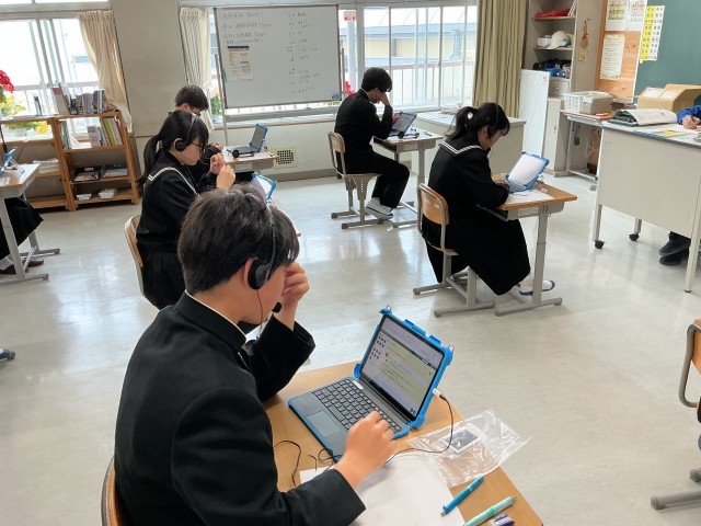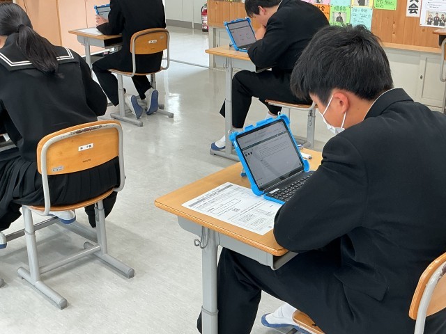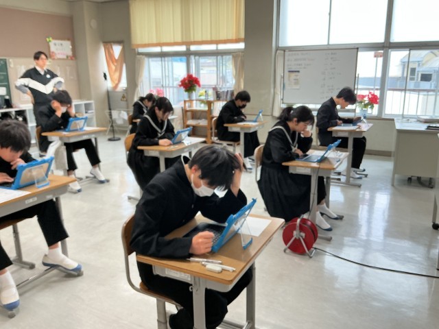 3年生が全国学力学習状況調査を行いました。学習用タブレットを使って、英語の書くこと・読むこと、英語の聞くこと、生徒質問調査に取り組みました。マシントラブルもなく、スムーズに調査が実施できました。