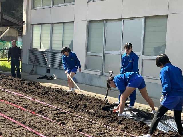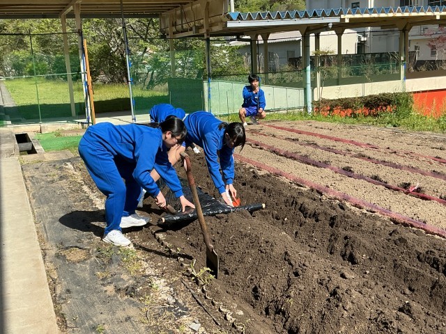 栽培の分野で使用する畑の畝作りに協力しながら取り組んでいます。