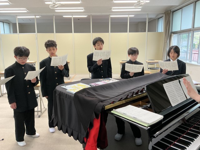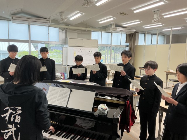 音楽では校歌の練習をしています。正しい音程とリズムで歌うことを意識しています。