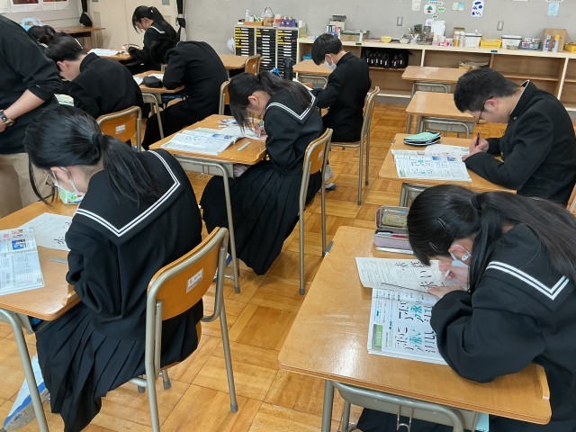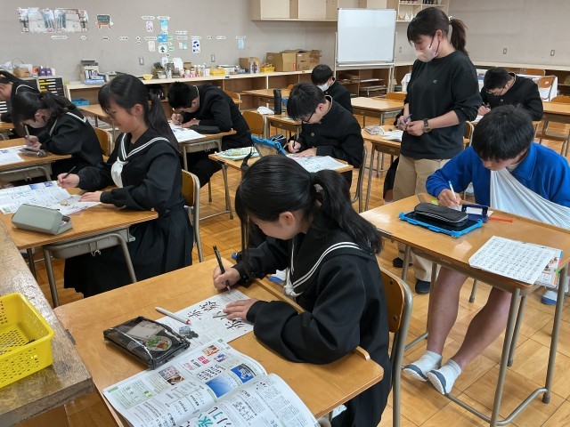 美術ではレタリングの重要性について動画で学び、手本をもとに練習しました。とても丁寧に取り組んでいます。
