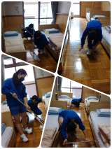 入所式を終え、ベッドメイキングに四苦八苦しています。