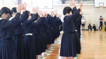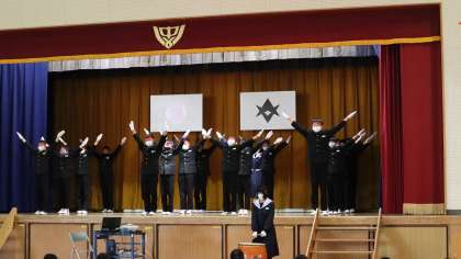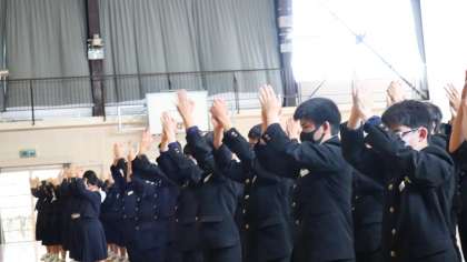3年生を中心に、1年生の入学を祝いました。井郷中クイズ、部活紹介、伝統のイエローリボン贈呈などが行われました。