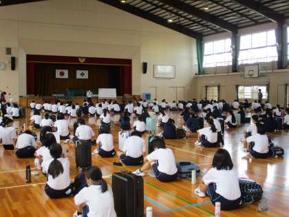 体育館で、修学旅行前日の集会です。