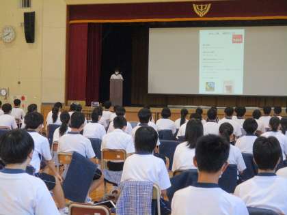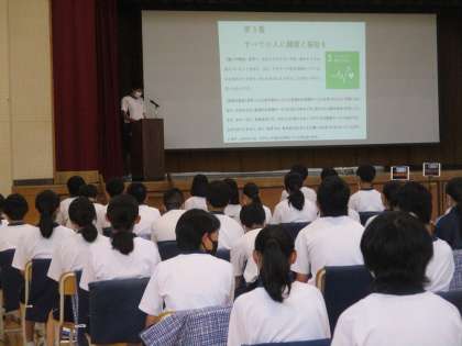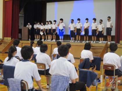 3年生が総合的な学習の時間でまとめたことの発表をしました。 公開日 2022/09/27 更新日 2022/09/27 教育活動の様子 9月26日、3年生の学習で、体育館で自分のまとめを 発表する時間を設けました。 「総合的な学習の時間」に、3年生はSDGSに関すること を一人一人テーマを決めて調べ、自分の考えを整理して、 何ができるか(自分に、自分たち井郷中生で)をまとめ ました。 今日は体育館で一人一人の意見発表をしました。