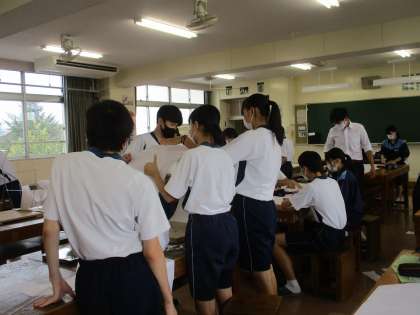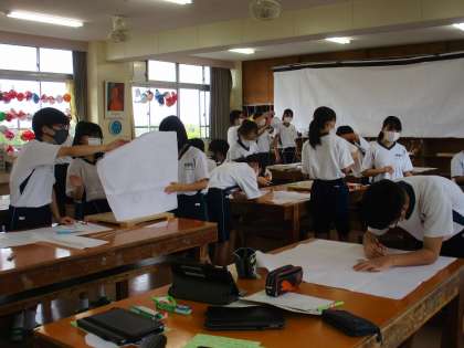 3年生 美術科の学習の様子です。 公開日 2022/09/29 更新日 2022/09/29 教育活動の様子 3年生の美術科では、共同制作を進めて います。「地球問題を光の芸術で発信しよう」 というテーマで、共同制作で協働学習をして います。 グループでどんな問題を取り上げようか を話し合い、情報を集め、整理して自分たち が何を発信したいかを考えて、作品の制作に 取り組んでいます。