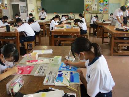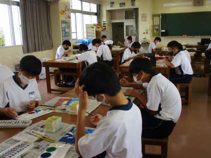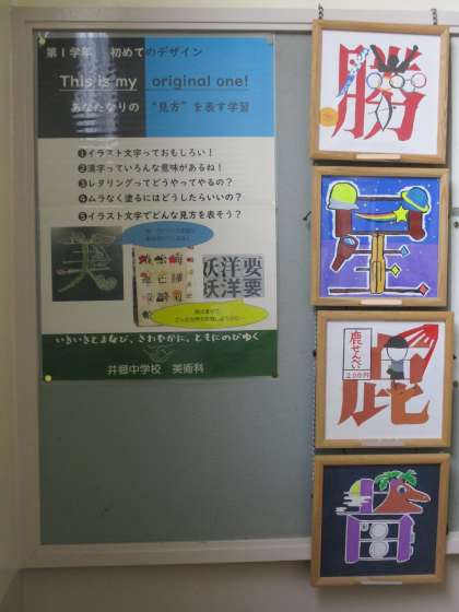 1年生 美術科の学習の様子です。 公開日 2022/09/30 更新日 2022/09/30 教育活動の様子 1年生の美術科で、イラスト文字を制作しています。 オリジナルの自分の創意工夫で、字を選び、その字の イメージを想像を膨らませて創造していきます。 廊下には、昨年の作品が飾ってありました。完成する と、こんな出来上がりになるのでしょう。