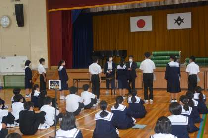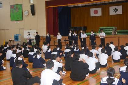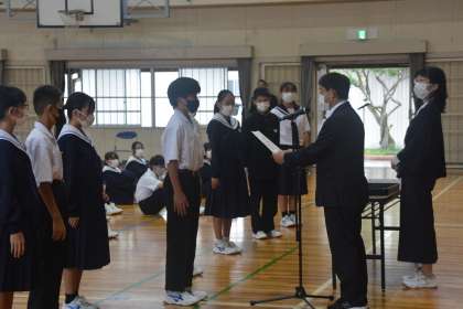 1年生の認証式をしました。 公開日 2022/10/13 更新日 2022/10/13 教育活動の様子 10月13日の朝の時間で、1年生の後期学級役員の 認証式を行いました。 各学級の学級委員、書記、評議員の認証です。 入学から半年たち、立派に成長してきました。それぞれ の個性を伸ばし、切磋琢磨して伸び合えるように、高め合 えるようしていきましょう。 リーダーだけでなく、フォロワーとしてみんなが協力し て助け合い、学級を学年を成長できるようになってほしい です。