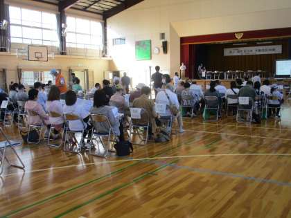 体育館の舞台で会議をしています。