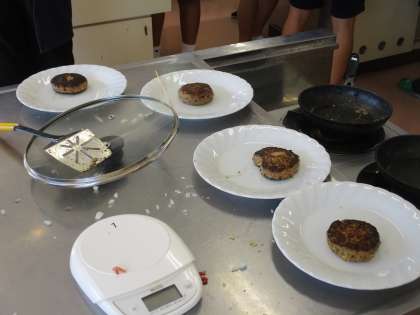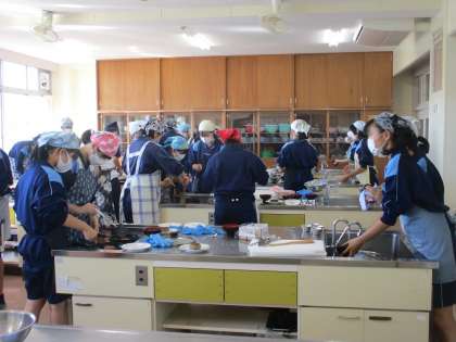 3年 家庭科の学習の様子です。 公開日 2022/10/21 更新日 2022/10/21 教育活動の様子 3年生と2年生で、調理実習を行っています。 この写真は、3年生です。3年ぶりの調理実習 なので、同じメニューでハンバーグを作ります。 調理実習は久しぶりですが、手際よく、自分の 分を調理していきます。感染対策をして取り組ん でいます。 美味しそうなハンバーグができ上りました。