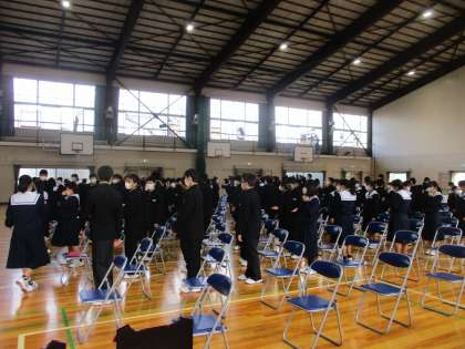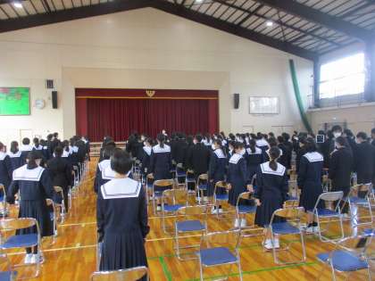 いよいよ合唱コンクールが始まります。 公開日 2022/10/22 更新日 2022/10/22 教育活動の様子 10月22日合唱コンクールの入場です。 これは1年生の入場です。感染対策のため密を 避け、1年生から順に、学年ごとに合唱を披露し ました。 この時、2・3年生は教室でオンラインで聴い ています。