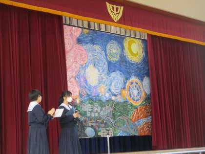 合唱コンクールの始まりです。 公開日 2022/10/22 更新日 2022/10/22 教育活動の様子 開会セレモニーが始まりました。 開会宣言の後、美術部の展示の披露が ありました。 豊田市や井郷の特色も表現しています。 今と未来の姿も描き表しています。この 素敵な絵を背景に合唱を歌いました。