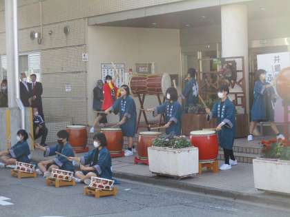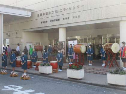 「井郷地区ふれあい祭」での活動の様子です。(1) 公開日 2022/10/26 更新日 2022/10/26 WE LOVE いさと 9時45分〜和太鼓部による呼び込み太鼓で 幕開けです。 まずは1年生中心の編成でのパフォーマンス です。