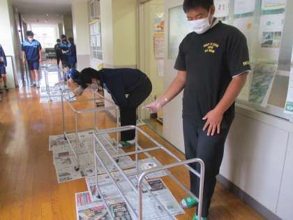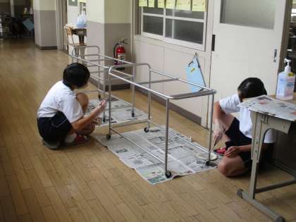 給食で使っている配膳台をきれいにしました。