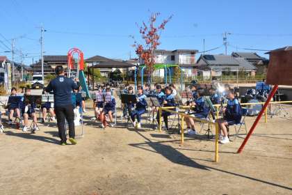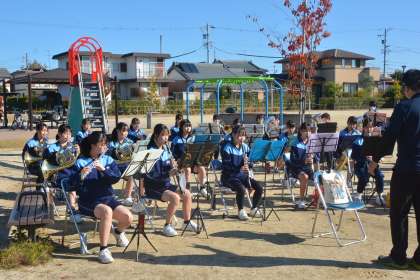 地域で活躍する井郷中生の様子です。(2) 公開日 2022/11/04 更新日 2022/11/04 特色ある教育活動 11月3日に吹奏楽部とボランティアの子どもたち が、公園で練習をしました。 実は11月6日のセレモニーのリハーサルです。 井上町10丁目公園で地域のイベントに吹奏楽部の 演奏とボランティア生徒が盛り上げ役として出演しま す。