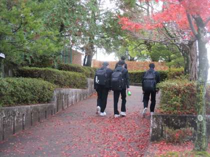 イロハモミジが落葉した道を通って登校して