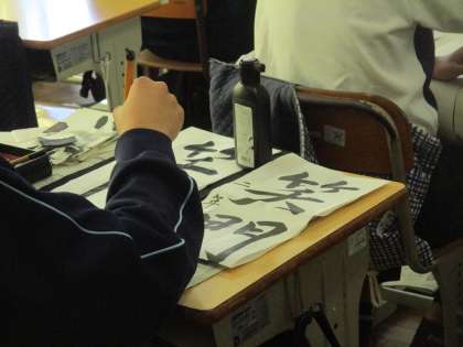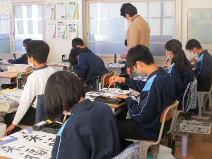2年生 国語科(書き初め)の学習の様子です。 公開日 2022/12/09 更新日 2022/12/09 教育活動の様子 今日も、外部講師の先生に来ていただいて書写 のアドバイスをいただきました。 これで3日間で1年生・2年生・123学級に 1時間ずつご指導をしていただきました。 写真は、2年生の様子です。 1年生は「公明正大」、2年生は「笑門来福」 3年生は「理想の実現」を書いています。 1月10日の書き初め大会では、最高の作品に 仕上げてほしいです。