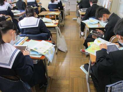 学習用タブレットと地図帳とを見比べて、