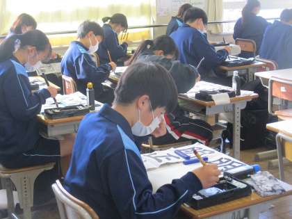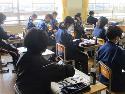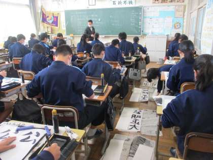 1月10日、書き初め大会をしました。 1年生は「公明正大」と集中して書き上げ ました。