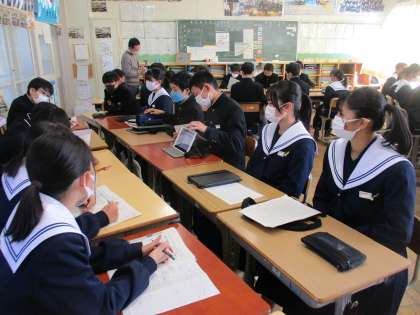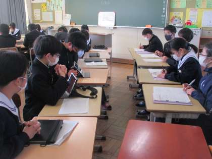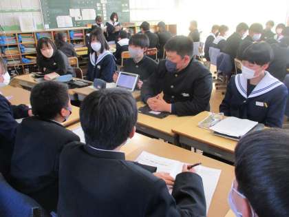 職場体験報告会(2) 公開日 2023/02/22 更新日 2023/02/22 教育活動の様子 2月22日に2年生が1年生に向けて 職場体験報告会を開きました。 2年生が学習用タブレットを使って 説明しました。1年生は、真剣に聞き、 質問をして、自分のこととして職業や 働くことを考えていきました。