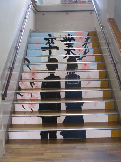 昨日までに取り付けられた、桜の飾りや昇降口
