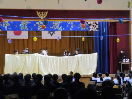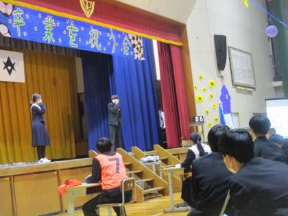 卒業を祝う会(1) 公開日 2023/03/02 更新日 2023/03/02 教育活動の様子 在校生から卒業生への感謝の気持ちが 伝わるとても楽しい、温かい時間でした。 卒業生はこの1年を振り返り、最上級生 としての1年を振り返り、「卒業」への思い を深めていました。