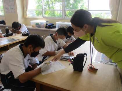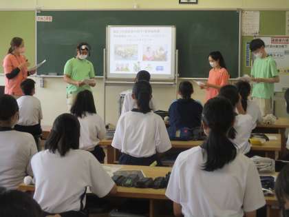 1年生 高齢者疑似体験から学ぶ(1) 公開日 2023/07/14 更新日 2023/07/14 教育活動の様子 7月10日と11日で、1年生の各学級 で家庭科の学習として、高齢者の疑似体験 をしました。学区にある高齢者施設福寿園 の職員の方に特別講師となっていただき、 教えていただきました。 豊田市の社会福祉協議会から装具を多く お借りして、体験することができました。