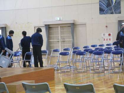 明日の卒業式の準備をしています。(1) 公開日 2024/03/05 更新日 2024/03/05 学校行事 3月6日卒業式の準備を在校生が しています。 てきぱきと体育館の会場づくりを していきます。