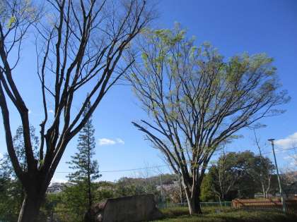 4月、温かくなり葉が大きくなってきました。 校歌の歌詞にある「一樹」は大きく育ちます。
