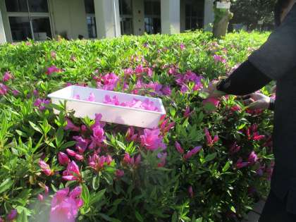 朝、理科の教員が、学習の準備でつつじを採集