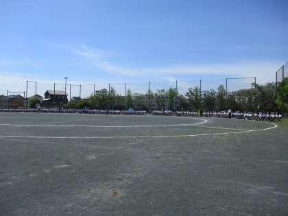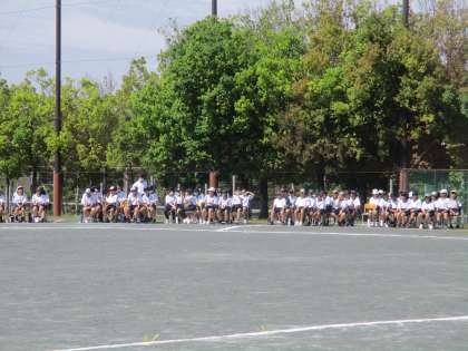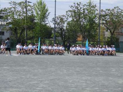 体育祭の全校練習をしました。(1) 公開日 2024/05/15 更新日 2024/05/15 教育活動の様子 体育祭の全校練習をするために、椅子を応援席 に運んで待機しています。 水分補給のための水筒や、日差しを避けるため に帽子をかぶっています。