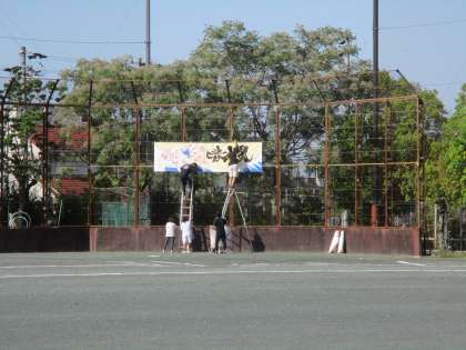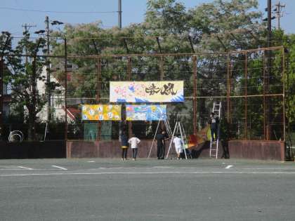 美術部の作品を、早朝出勤の職員で取り付けました。