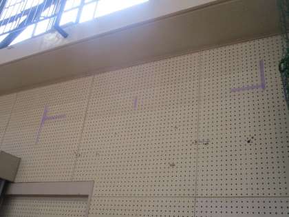 体育館の壁のあちこちに、薄い紫色