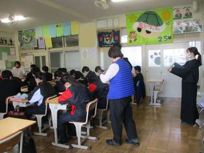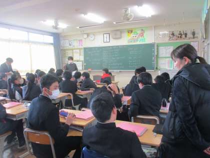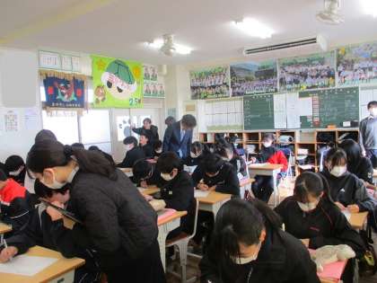 小中交流の研修会をしました。(1) 公開日 2024/12/19 更新日 2024/12/19 校長メッセージ 英語科の学習について、小中連携が できるように、小学校の先生に中学校 の授業を参観してもらいました。 小学校の外国語活動、英語科と中学校 の英語科の学習のつながりと違いを意見 交流ができました。