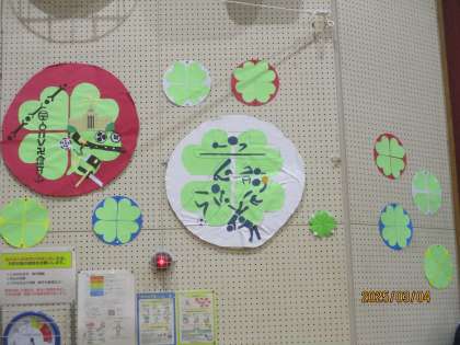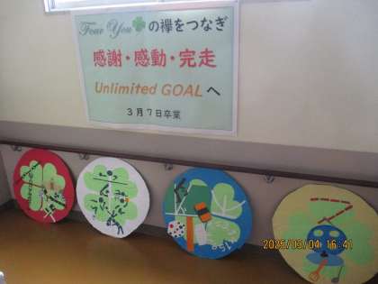 卒業を祝う飾りです。 学年スローガンを基に作成 してくれました。
