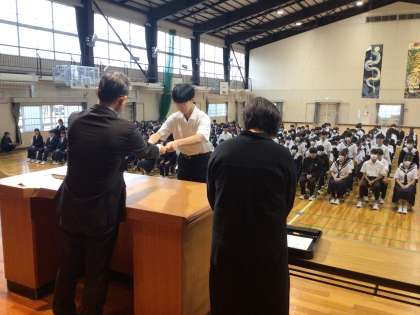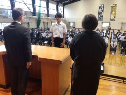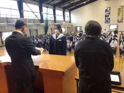 4月28日(月)第1校時、体育館で認証式を行いました。素晴らしい返事やきびきびした態度など、やる気に満ち溢れた生徒たちの姿から、今後の成長への大きな期待を抱きました。