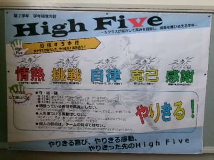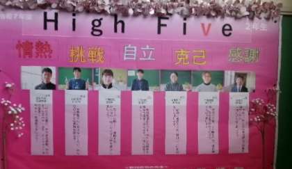 2年生の学年掲示です。「Hight Five」5クラスが高みを目指す5本柱があります。