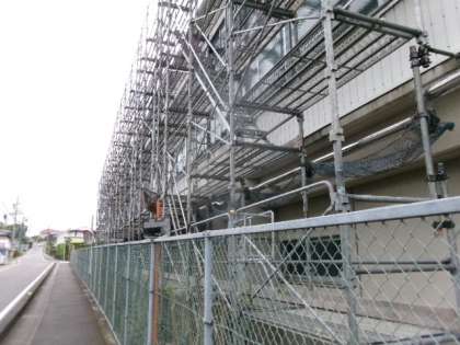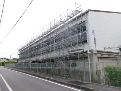 体育館の屋根壁修繕工事のため、足場が組まれています。テスト中は音が出ない工事をお願いしています。