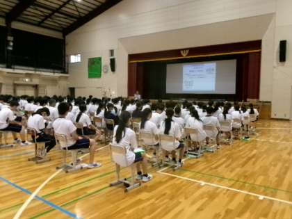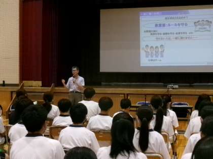 6月30日(月)第5校時体育館にて外部から1名の講師の方をお招きして、職業意識形成支援事業における職業講話(キャリア探索プログラム)を受けました。ルールを守ることの大切さを改めて感じました。